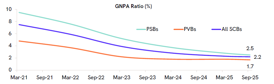 - Banking sector asset quality continues to improve, with the GNPA ratio easing to 2.2% in Sep’25 from 2.3% in Mar’25. RBI stress tests project the GNPA ratio at 1.9% by March 2027 under the baseline scenario, lower than the earlier estimate of 2.5%.