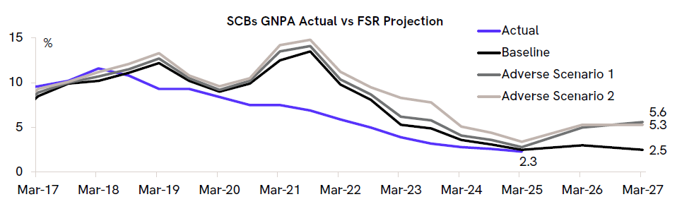 - The banking sector’s asset quality continues to improve, with the GNPA ratio at a multi-decade low. RBI’s stress tests project the GNPA ratio to rise marginally to 2.5% by March 2027, from 2.3% in March 2025 under the baseline scenario.