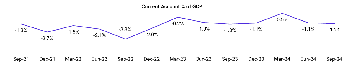 India’s current account recorded a deficit of 1.2% of GDP in Q2FY25, compared to 1.1% in the previous quarter and 1.3% in Q2FY24. The higher merchandise trade deficit was offset by an improvement in the services surplus and an increase in remittances.