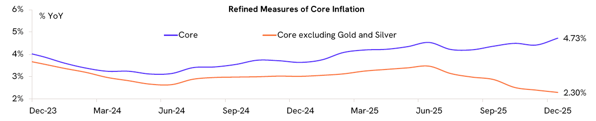 Core inflation (which excludes food and fuel) picked up to 4.7% YoY in December 2025. Excluding gold and silver, core inflation was 2.3% YoY, indicating that underlying inflationary pressures remain low.