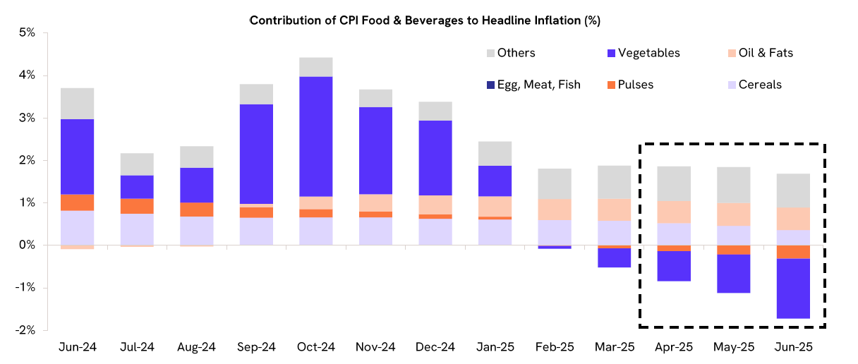 The decline in headline inflation was driven by a fall in food inflation to -0.2% YoY in June 2025 from 1.5% YoY in May 2025. Within food, a lower contribution from vegetables drove the decline in headline inflation, followed by pulses. Vegetable inflation eased to -19.0% YoY in June 2025 from -14.0% YoY in May, on account of a muted 7% MoM rise in vegetable prices, compared to a sharper 14% MoM increase in June last year. Pulses inflation remained steady at -12% YoY.