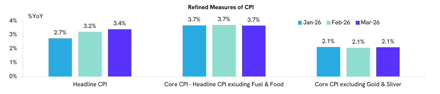 Core CPI (which excludes food and fuel) remained unchanged at 3.7% YoY in March 2026, supported by higher gold and silver prices. However, core inflation excluding gold and silver remained significantly lower at 2.1% YoY, indicating subdued underlying price pressures.