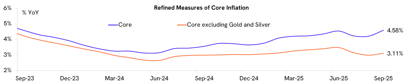 Core inflation (excluding food and fuel) picked up to 4.6% YoY, primarily due to a rise in gold & silver prices. Excluding gold and silver, core inflation was more moderate at 3.1% YoY, indicating that underlying inflationary pressures remain muted.