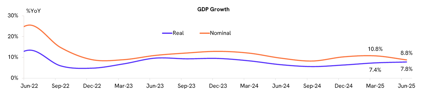 India Q1FY26 Gross Domestic Product (GDP) growth accelerated to 7.8% YoY from 7.4% YoY in the previous quarter, significantly exceeding the RBI’s projection of 6.5% YoY. Gross Value Added (GVA) picked up to 7.6% YoY in Q1 from 6.8% in Q4FY25, driven by strong ‘financial services, real estate and professional services’ growth.