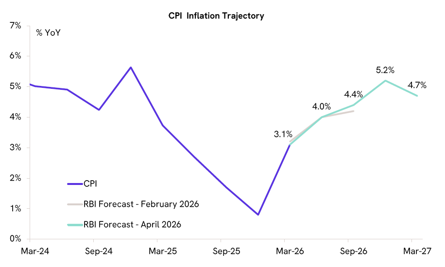 The RBI projected FY27 inflation at 4.6% YoY, with upside risks driven by energy price pressures and weather disturbances. The West Asia conflict has imparted significant uncertainty to the near-term inflation outlook. However, near-term food supply prospects have been bolstered by a robust rabi crop, offering some comfort.